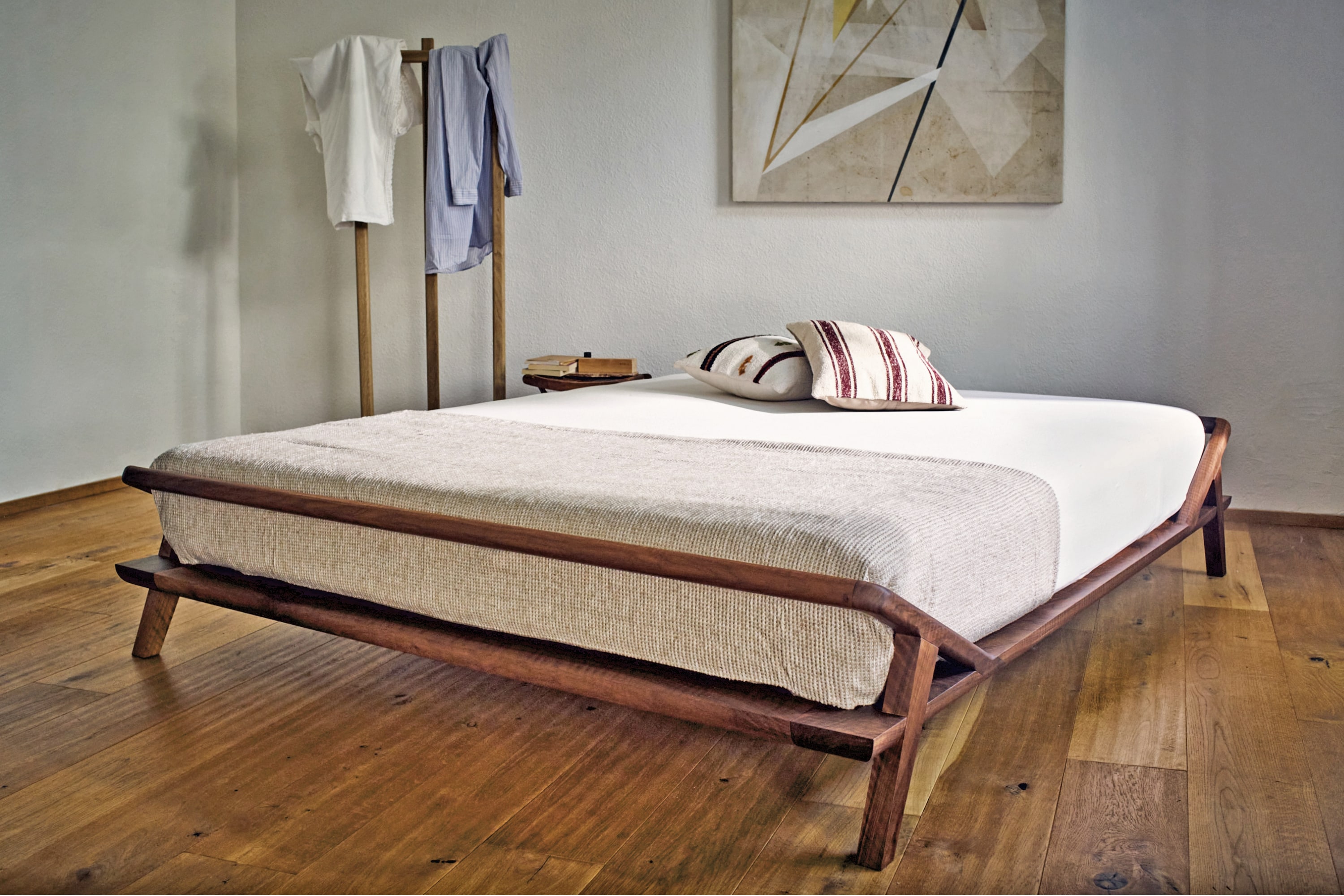 Die zwei Rolllattenroste sind integriert und durch einen Mittelbalken gestützt. Sie können individuell im Härtegrad verstellt werden. Am besten passen Matrazen mit einer Dicke von 22–25cm.